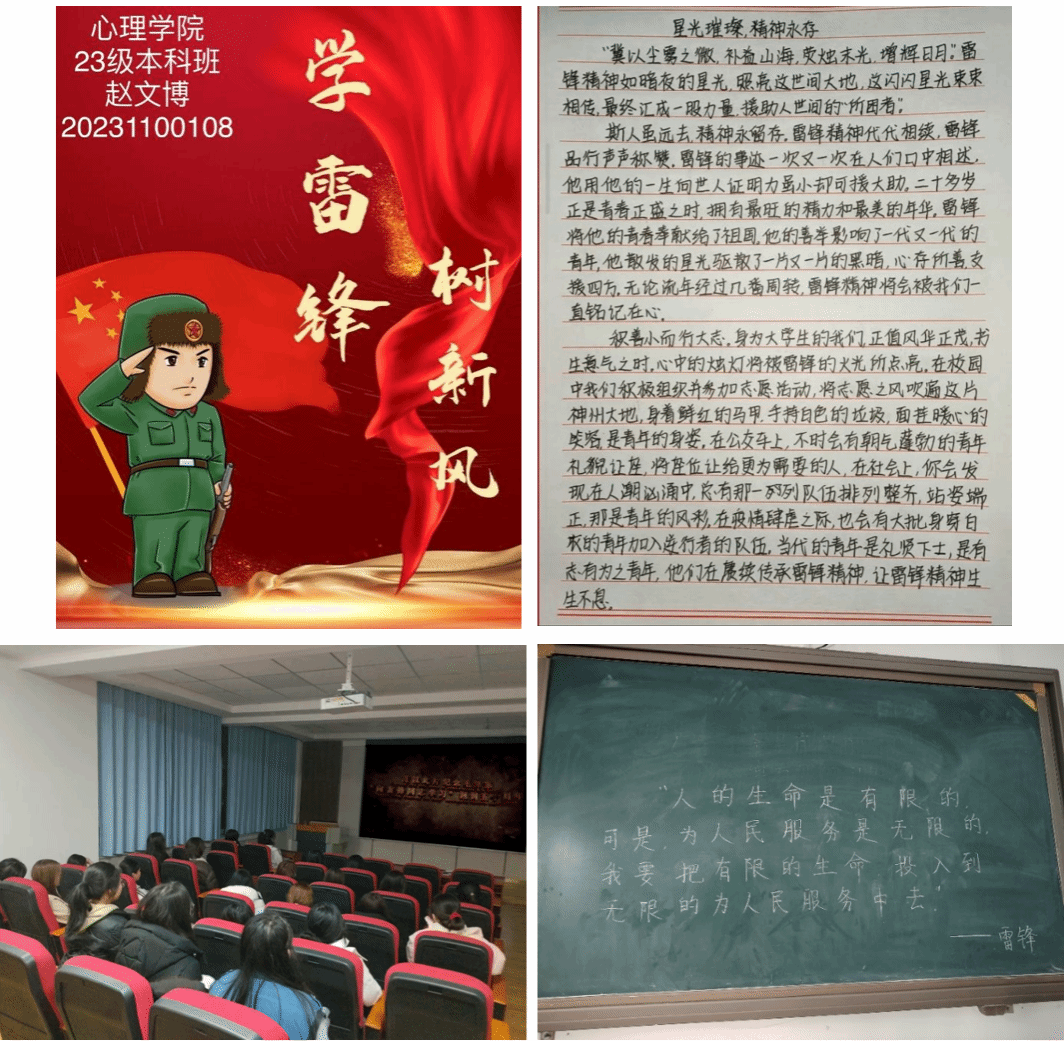 思想引领铸信念,知行合一学雷锋。春风送暖,三月芳华,为弘扬雷锋精神,践行新时代青年使命,beat365官网以“雷锋精神暖三月”为主题,开展了系列特色活动,将心理专业优势与志愿服务深度融合,让雷锋精神在校园里生根发芽,在社区中传递温暖。通过多维宣传,学习雷锋精神,组织学生赏析影片《雷锋》《青春雷锋》、组织开展“雷锋精神与我”主题演讲比赛、创意海报设计大赛、书法比赛、征文比赛等活动,以水墨丹青与现代设计融合,诠释“钉子精神”与“螺丝钉品格”、以笔为媒,书写雷锋箴言与感悟,让“奉献、友爱、互助、进步”的志愿信念扎根心田。