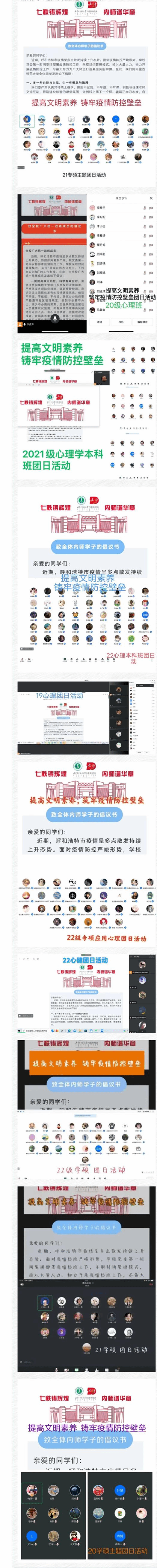 beat365唯一官网入口各个团支部10月5日晚至10月6日通过线上形式,组织召开主题为:提高文明素养,铸牢疫情防控壁垒的团日活动。活动中首先学习了10月5日学校召开的疫情防控及安全稳定工作会议的精神和要求。同时讲清楚了当下疫情形势的严峻复杂,校园安全稳定的重要性。二是学习了学校防疫政策,学生违纪行为的危害性,科学戴口罩等防护措施的必要性,严守纪律、严格按照学校安排做好核酸检测的重要性。三是讲情怀讲温度,引导学生厚植家国情怀、爱校情怀和责任担当。疫情当下学校的领导、学院的领导、辅导员是与学生同吃同住同甘苦的。引导学生从感情上建立同理心,多一份理解多一份以身作则。四是学习了学校发给全体学生的倡议书。