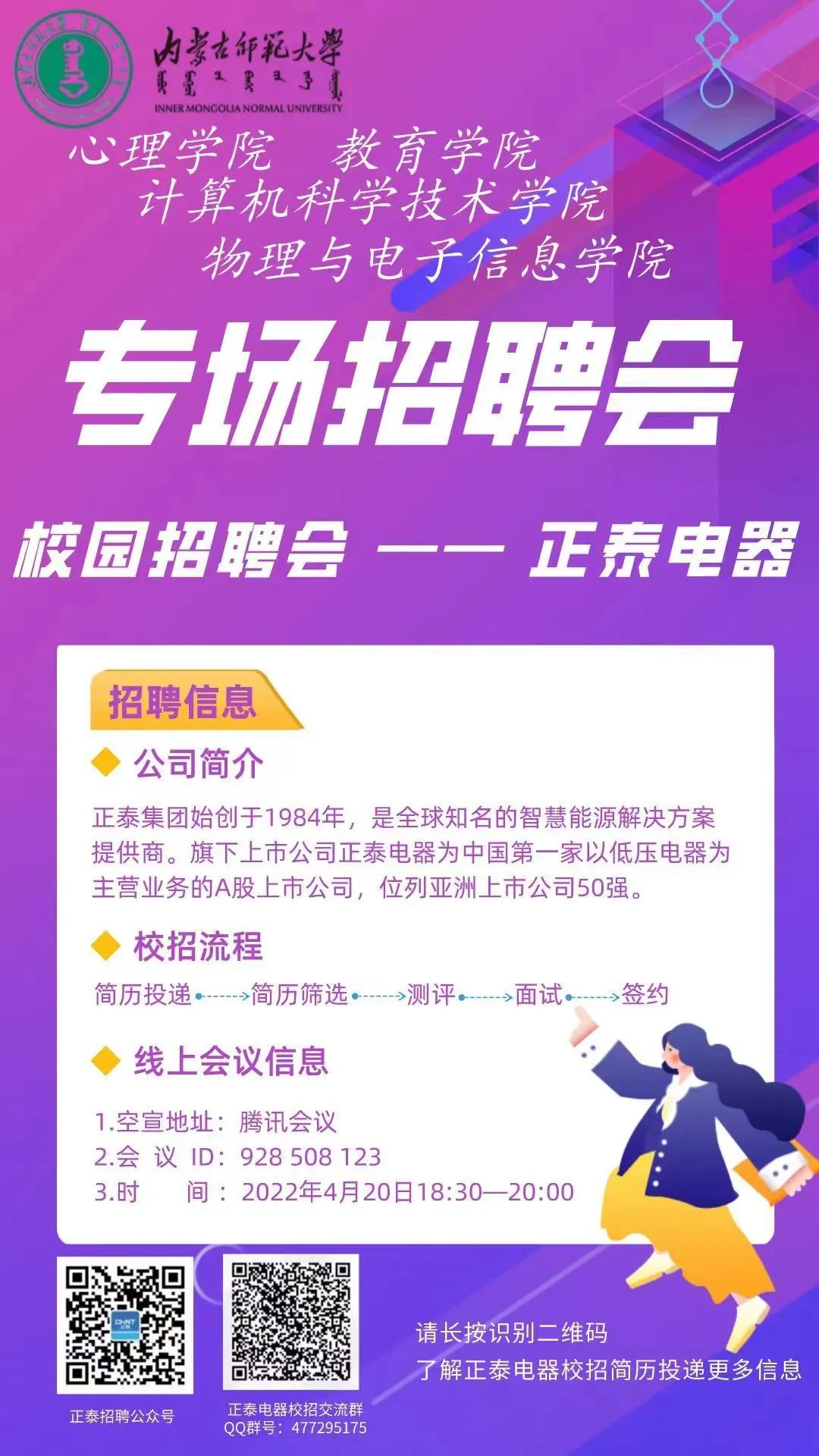 为深入贯彻党中央、国务院“稳就业”“保就业”决策部署,进一步做好毕业生就业工作,拓宽就业渠道,实现高质量就业, 4月20日,beat365唯一官网入口通过校友积极联系正泰电器,面向beat365唯一官网入口、教育学院、物理与电子信息学院、计算机科学技术学院等召开2022届毕业生线上专场招聘会。