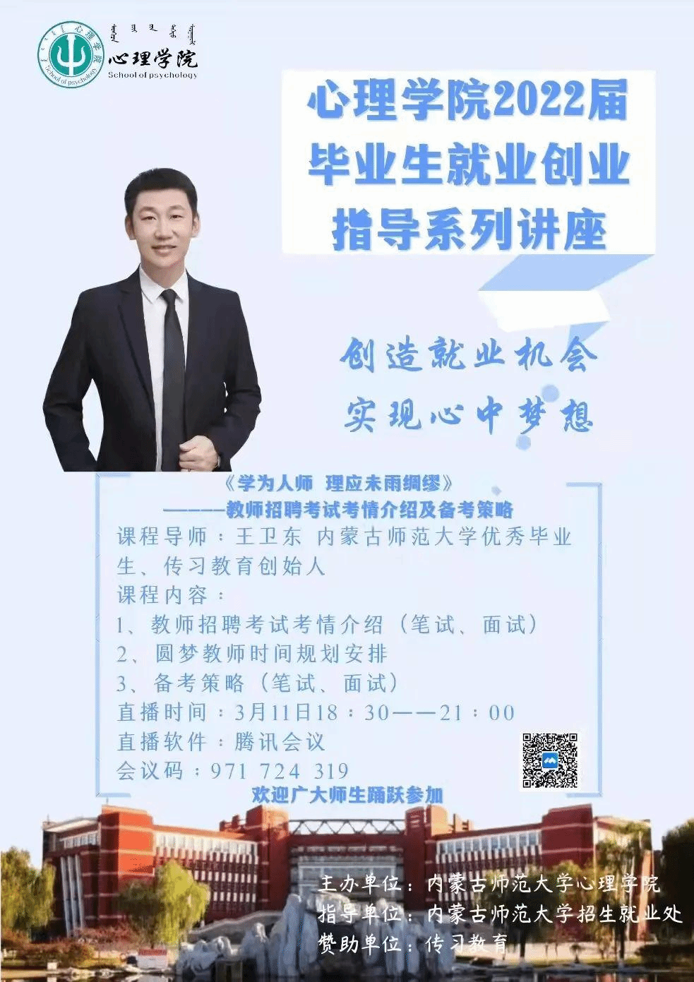 为贯彻党中央、国务院“稳就业”“保就业”决策部署,落实学校推进毕业生就业工作要求,促进beat365官网毕业生高质量就业。2022年3月11日,beat365唯一官网入口特邀请优秀校友、传习教育创始人王卫东为同学们开展“《学为人师 理应未雨绸缪》--教师招聘考试考情介绍及备考策略”专题讲座,学院党委副书记副院长张晓阳参会,学生工作与就业指导办公室主任张金钟主持。