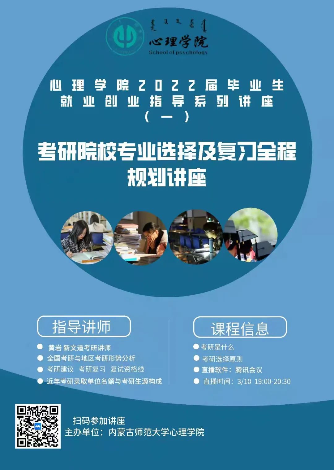 为丰富2019、2020级学生对考研的相关知识,激发学习热情、增强考研信心,beat365唯一官网入口于2022年3月10日晚19点开展了2022届毕业生就业创业指导系列讲座(一)——考研院校专业选择及复习全程规划讲座。