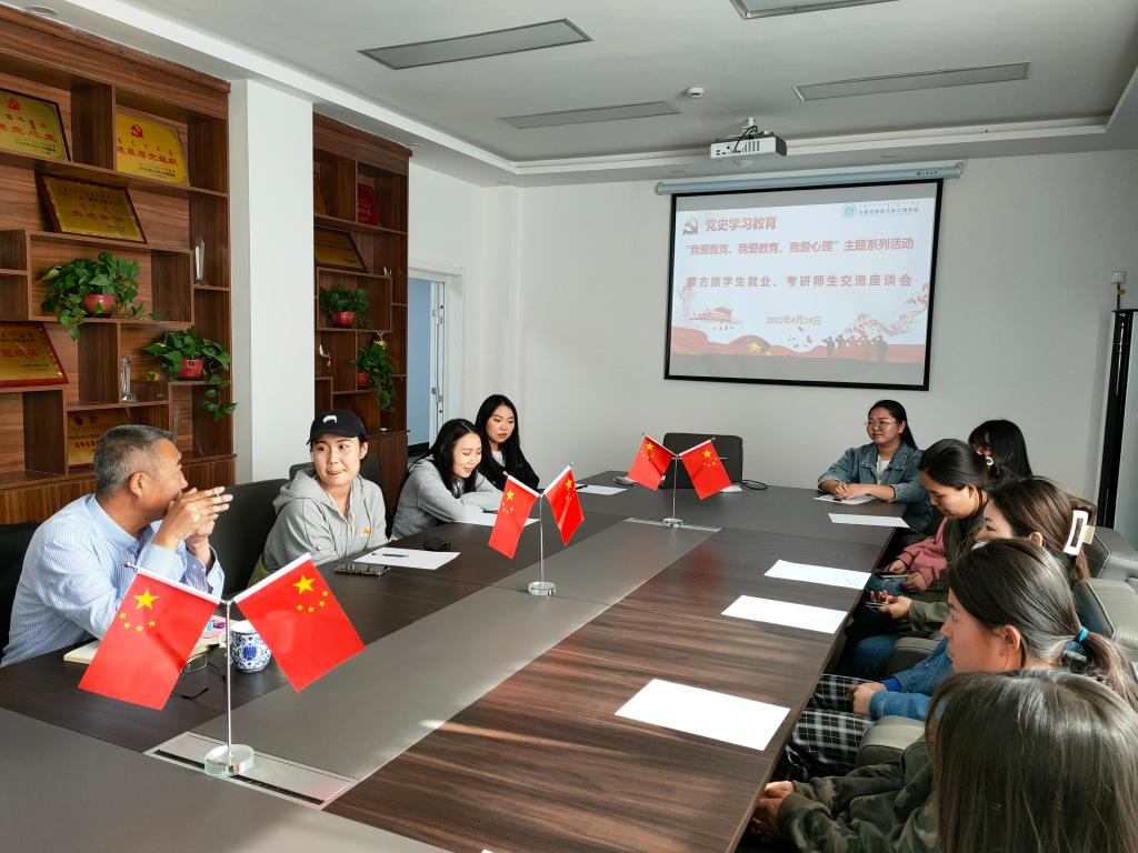 为扎实开展党史学习教育、推进“我为群众办实事”实践活动,贯彻落实党中央、国务院“稳就业”、“保就业”决策部署,积极推进beat365官网毕业生高质量就业,促进教育高质量发展,4月14日下午,beat365唯一官网入口党总支在学院楼B213会议室开展“我爱我党、我爱教育、我爱心理”党史学习教育主题实践活动——召开蒙古族学生就业、考研师生交流座谈会。党总支书记七十三、副书记张晓阳、学就办主任张金钟与2017级、2018级心理学专业学生进行交流座谈。